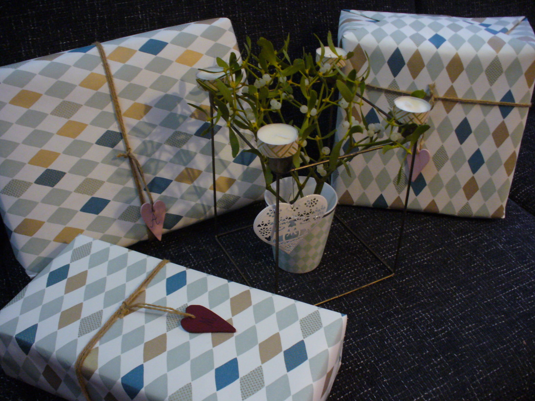 Ráda balím dárky a snažím se, aby to bylo pokaždé jinak. Letošní vánoční balení samozřejmě ještě neukážu, ale loňské už můžu. Nemám ráda vánoční papíry, které hrajou všemi barvami a motivy, ale líbí se mi vzory univerzální. Loni jsem zvolila vzor "harlekýn" a jako visačky jsem použila dřevěná srdíčka.