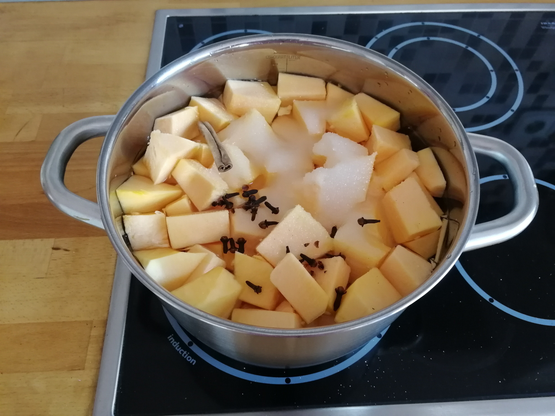 Tuto klasiku vařím v pětilitrovém hrnci. Oloupanou a očištěnou dýni nakrájím na větší kostky tak do 3/4 hrnce a doplním vodou do téměř plného hrnce, aby bylo hodně kompotové šťávy. Přidám svazek skořice, asi 15 hřebíčků a od oka cukru, řekněme 20 dkg (nevážím to). Vše se zamíchá, uvede do varu a vaří se 4 minuty. Do vychladlého kompotu vymačkám 2 citróny a nechám odležet v chladu do druhého dne. Dýně, která je sama o sobě planá, natáhne do sebe chuť přidaného koření a citrónu. Možno případně dosladit.