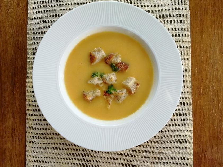 Do hrnce nakrájíme kus dýně, 1 mrkev a kousek zázvoru. Přidáme rozpůlenou cibuli, zalijeme vodou a vaříme asi 1/4 hodiny. Vytáhneme cibuli a zbytek rozmixujeme. Na zahuštění nastrouháme 1-2 brambory (podle množství vody) a povaříme další čtvrthodinku. je dobré přidat i kousek bujonu. Zbývá už jen dochutit solí, pepřem a zjemnit smetanou. Osmažený chleba a petrželka se přidá až na talíř.