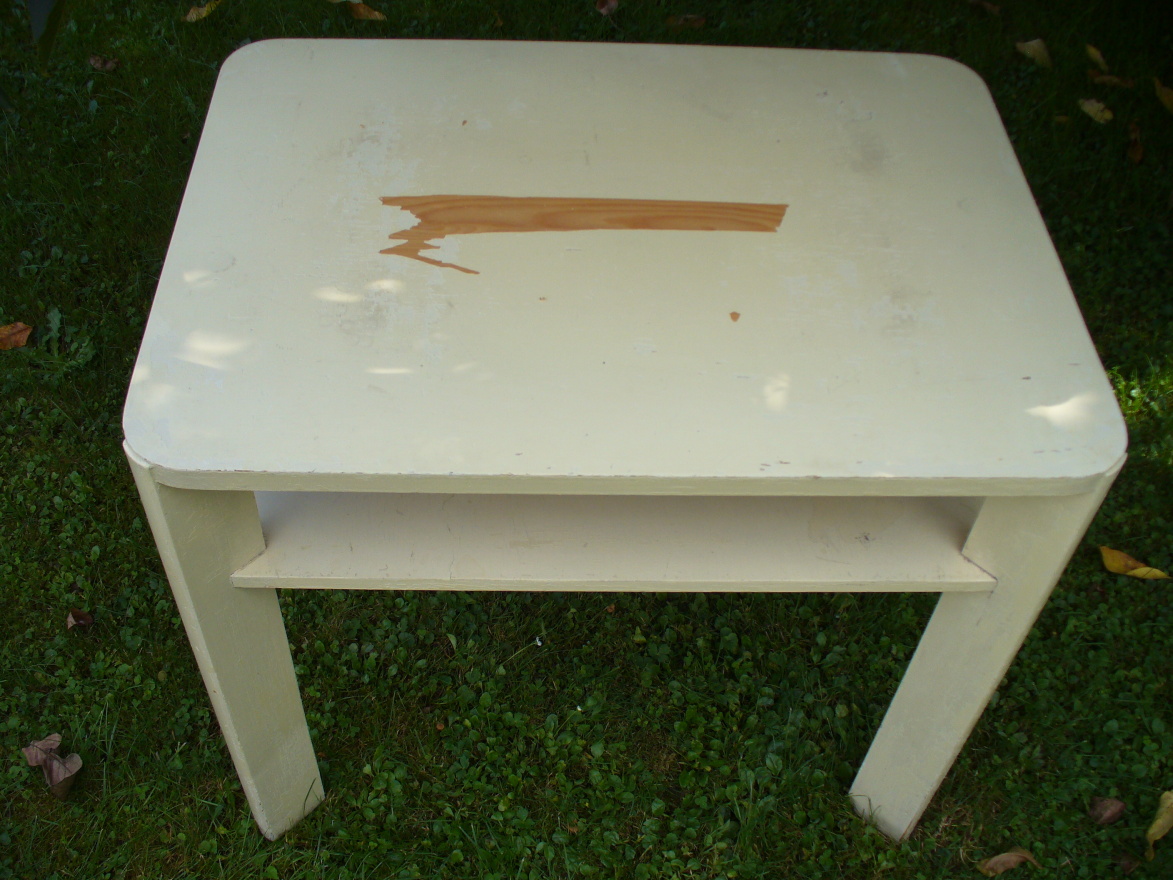 Stejně jako komoda byl oblepený tapetou s dekorem dřeva. Dekor dřeva však není dřevo. Tapetu jsem sloupala a objevil se popraskaný emailový nátěr.