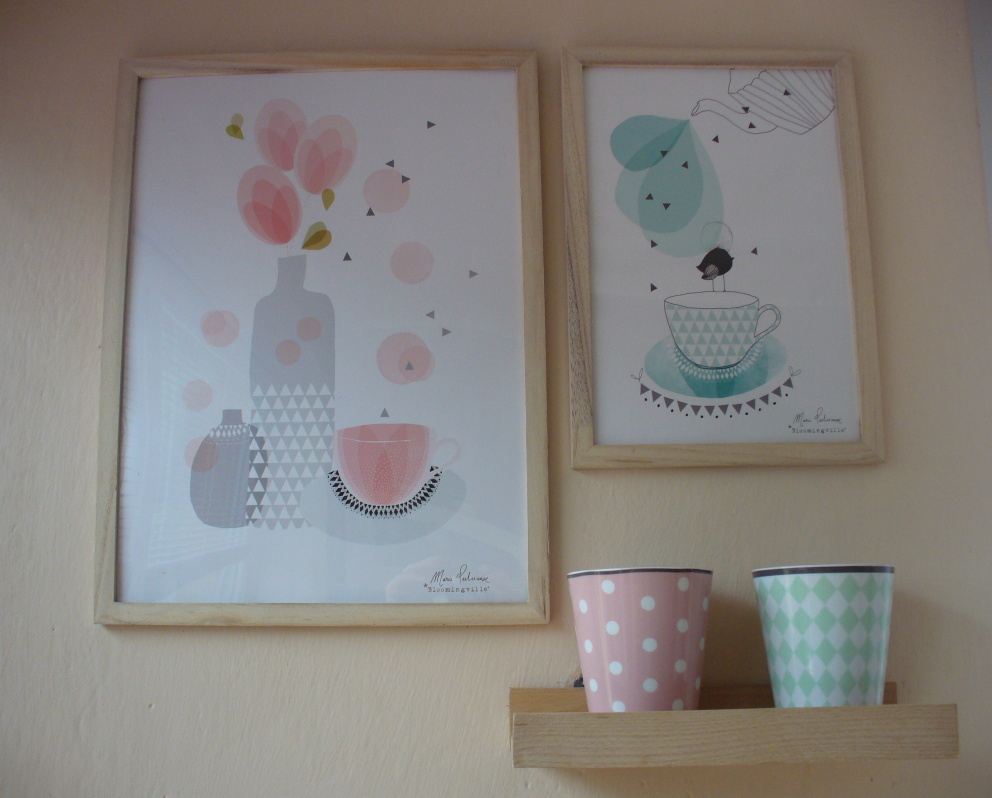 Jemné pastelové obrázky od Bloomingville navozují pohodovou atmosféru nad šálkem čaje nebo kávy. Chtěla jsem je však nějak zhmotnit a vnést více do prostoru, a tak jsem k nim přidala hrnečky se stejným dekorem, které jakoby vystoupily z obrázků. Navíc je můžu použít právě na ty chvilky pohody. Poličku, stejné barvy jako jsou rámečky, jsem vyrobila ze dřeva starého šuplíku.