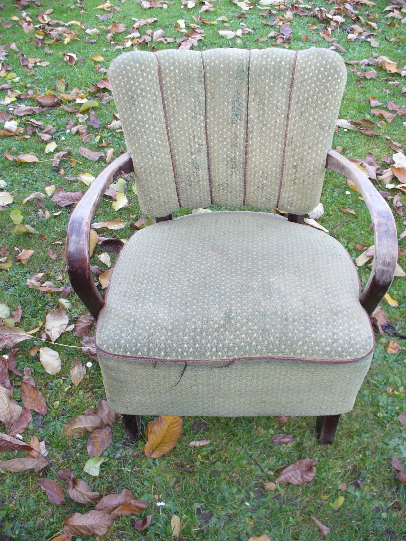 Leželo na hromadě harampádí nachystaného na odvezení do odpadového kontejneru. Takové nádherné křeslo! Tak jsem přijela autem a šup tam s ním. Dřevěné části jsem přebrousila a přetřela. Konstrukci trochu sklížila a čalounění přenechala zkušenému čalouníkovi. Hezky se v něm lebedí.Na starých věcech se mi líbí, že mají něco odžito a určitě by mohly vyprávět. Později jsem se dověděla, že toto křeslo bylo kdysi v ředitelně školy, která už dnes neexistuje. Takhle vypadalo, když jsem si ho přivezla domů.