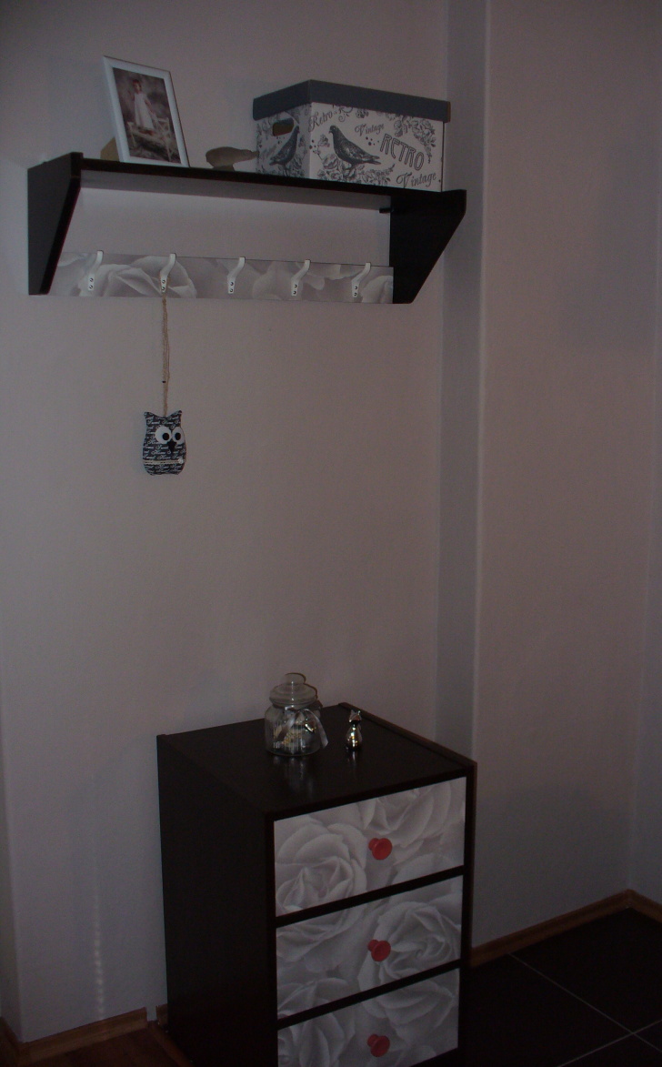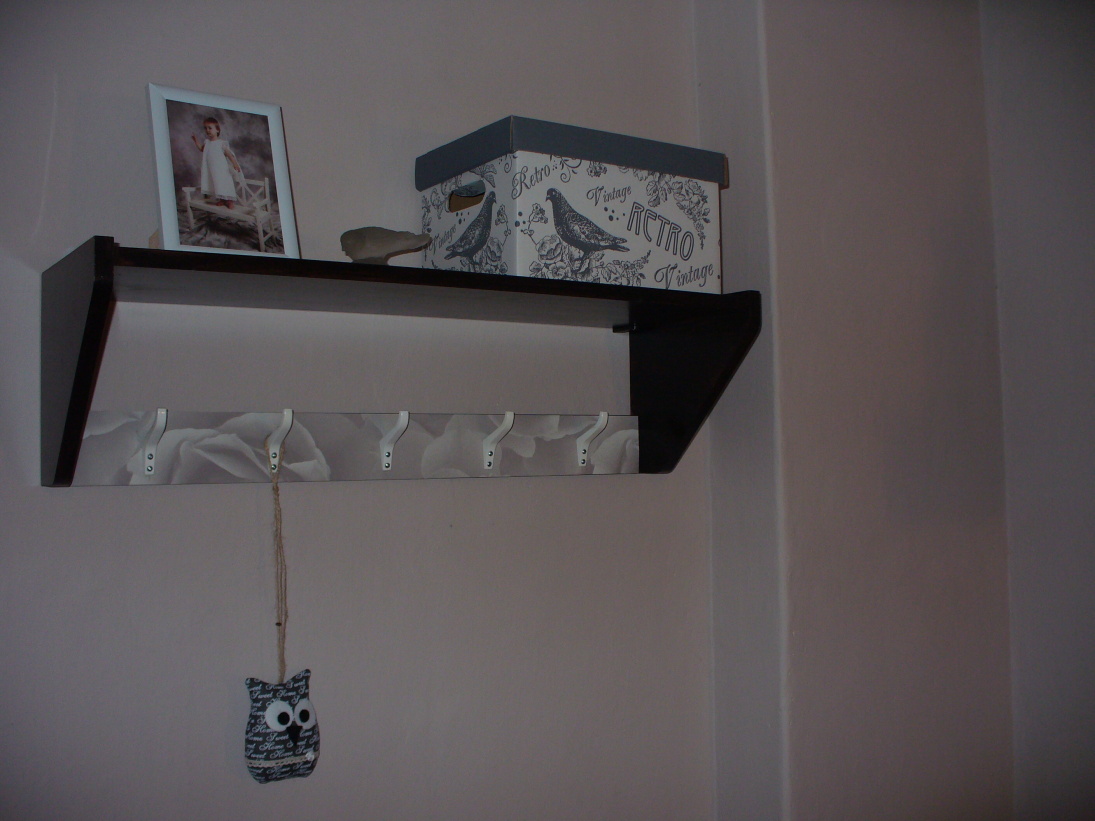 Před pár lety jsem v tombole na plese vyhrála poličku. Nehodila se mi ani vzhledově ani funkčně. Co s ní? Údělem mnoha tombolových výher je kolovat z tomboly do tomboly až se nakonec najde někdo, komu se hodí. Já jsem zvolila jinou možnost, nechala jsem ji uležet, dokud nedostanu ten správný nápad.Ten jsem dostala po dokončení komody v novém kabátku a pustila jsem se do proměny této nezajímavé poličky :