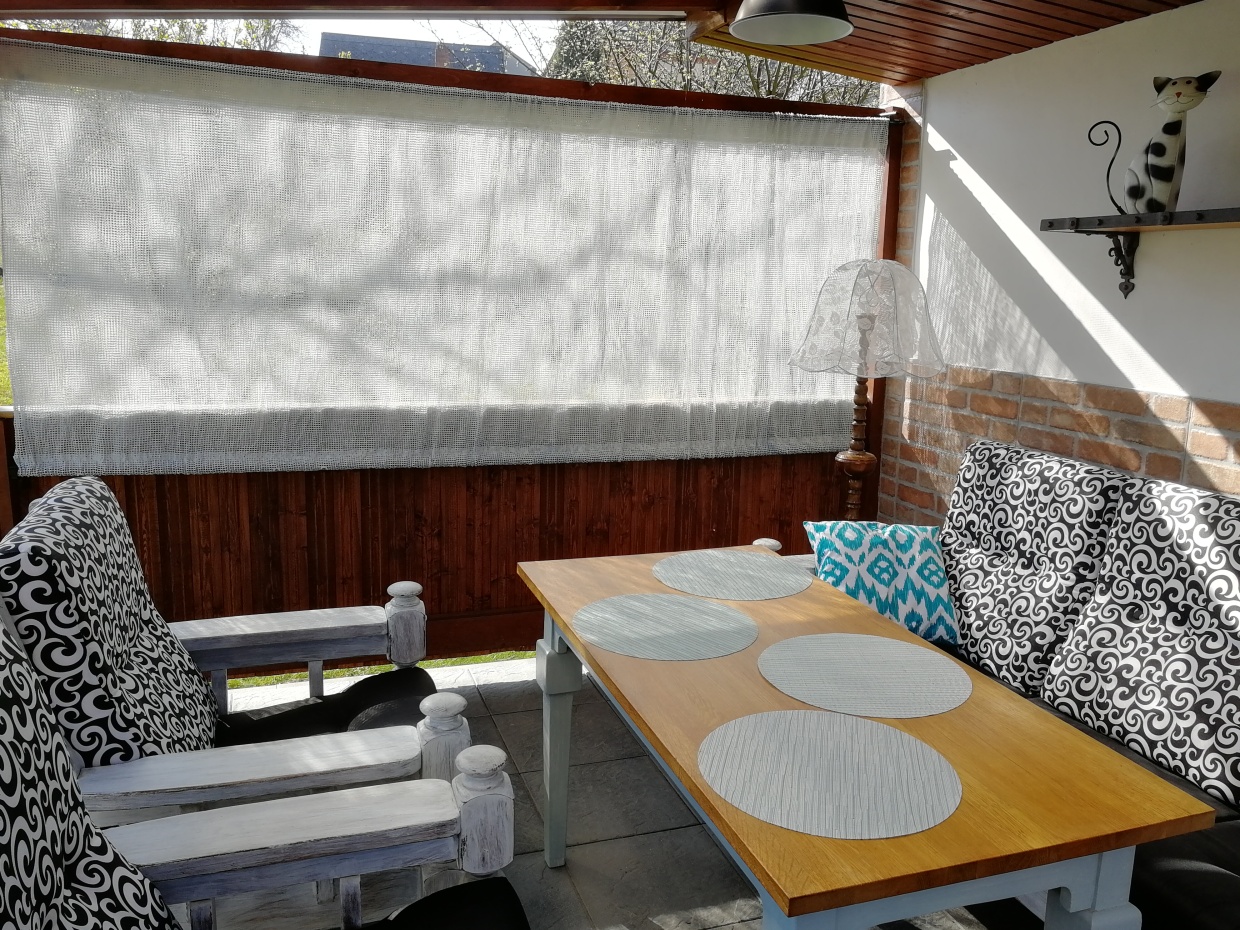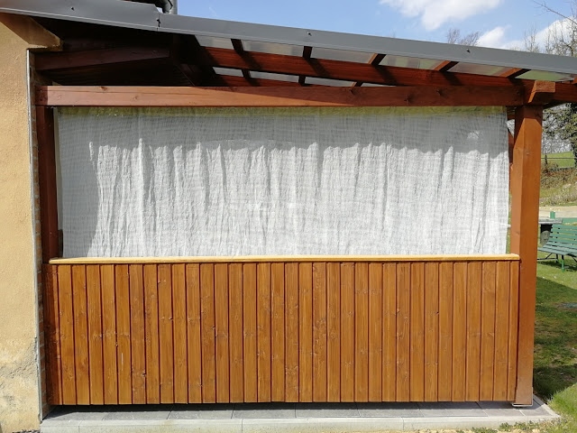 Nebyli jsme rozhodnuti jaké profi zastínění na stranu pergoly zvolit, tak jsem vloni pro zatím vytáhla dvě starší záclony, že to nějak pořeším. Postupným zdokonalováním a vychytáváním nedostatků se však ukázalo, že to je řešení, které nám vyhovuje, a tak zůstane trvale. Záclony jsem nejdříve obarvila směsí zelené a modré barvy, aby tolik nezářily bělostí. Navlékla jsem je na dvě samostatné tyče, protože jsme je chtěli nejen stahovat do stran, ale i překrývat podle potřeby.